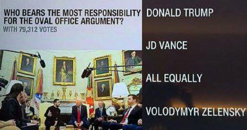 І от яка назва опитування: Хто найбільше винен у суперечці в Овальному кабінеті?За результатами опитування: