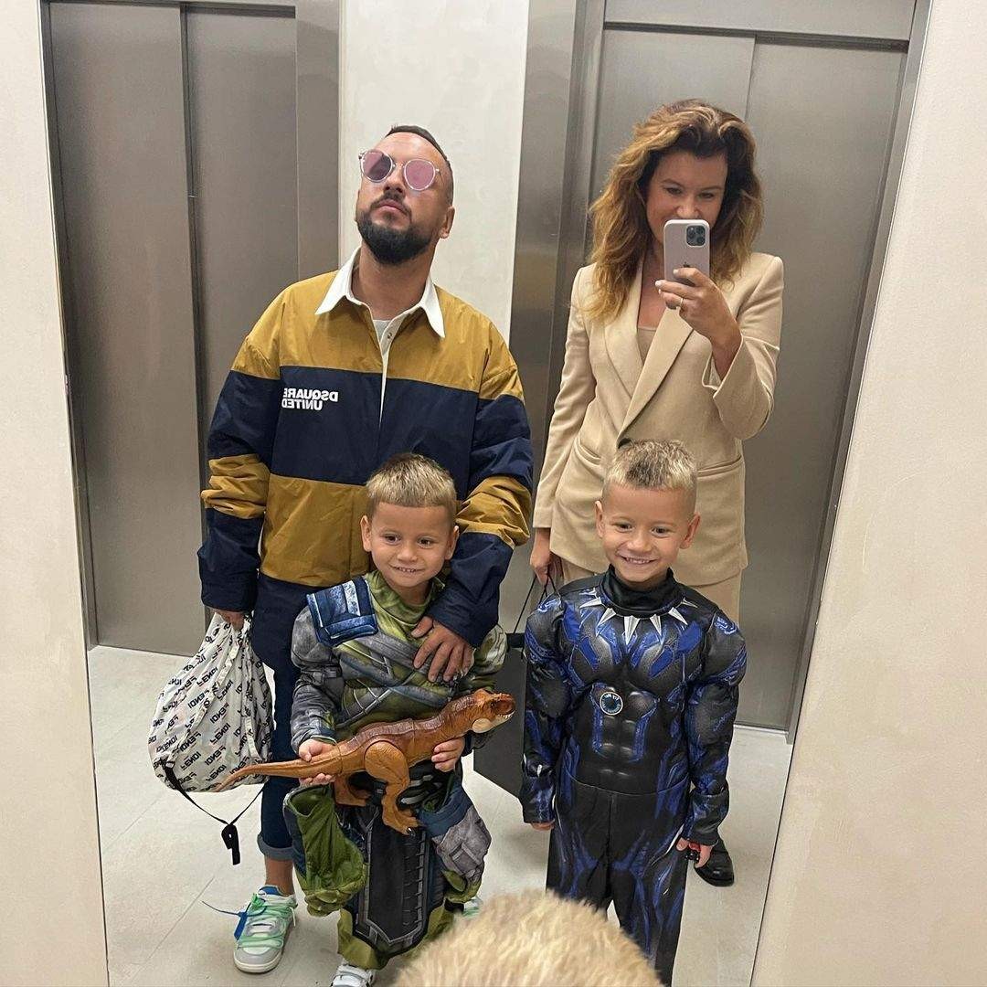 Дружина мультиартиста зробила селфі в ліфті. Ірина, Дмитро та їхні сини – Платон і Данило постали перед камерою. Зіркова матуся одягнула елегантний костюм бежевого кольору, а чоловік позував поруч із нею в синьо-коричневій смугастій куртці та джинсах.