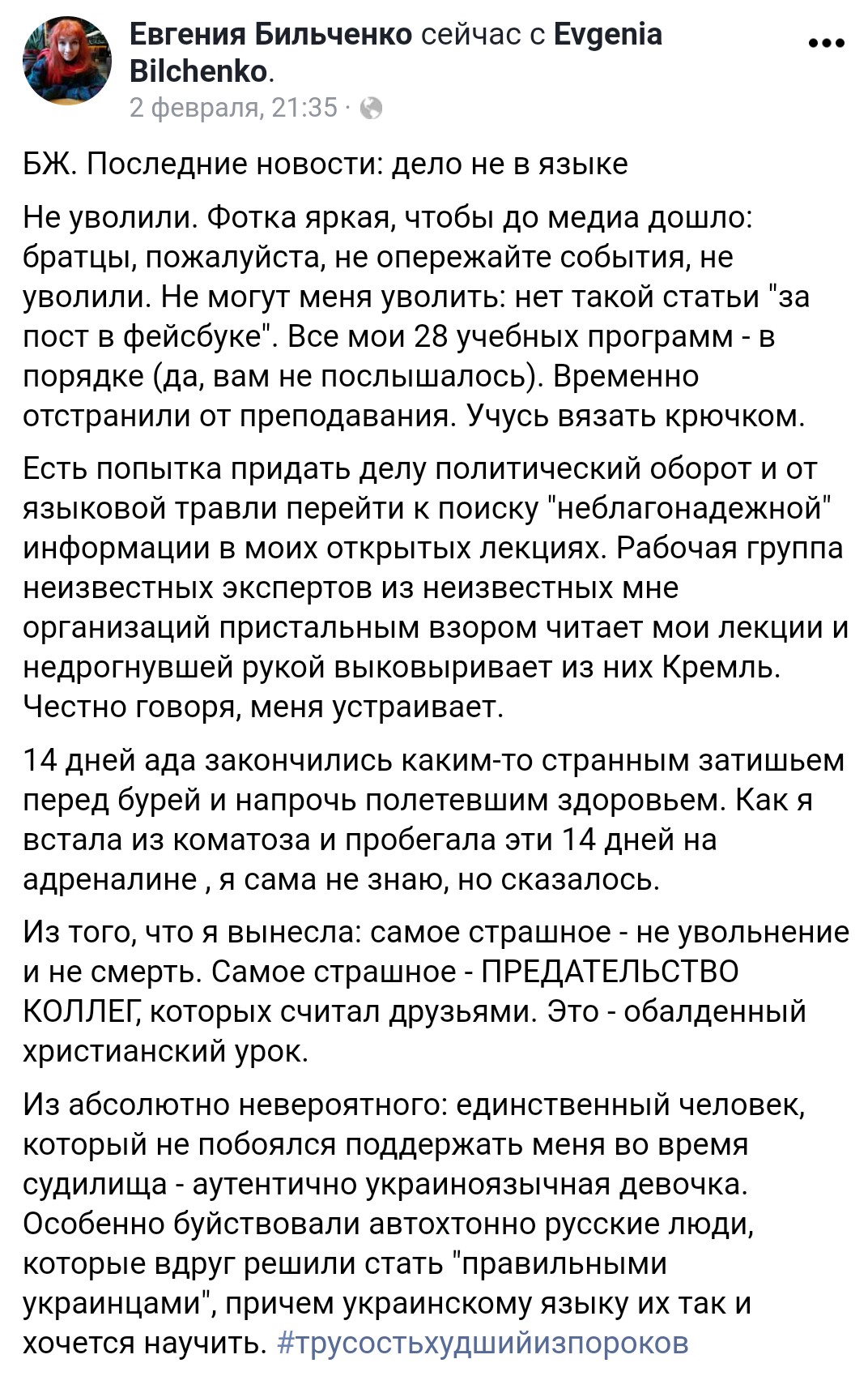“Не звільнили. Не можуть мене звільнити: немає такої статті “за пост у фейсбуці”. Всі мої 28 навчальних програм – в порядку (так, вам не почулося). Тимчасово відсторонили від викладання. Вчуся в’язати гачком. Є спроба надати справі політичного оберту і від мовного цькування перейти до пошуку “неблагонадійної” інформації в моїх відкритих лекціях”, – заявила викладачка.