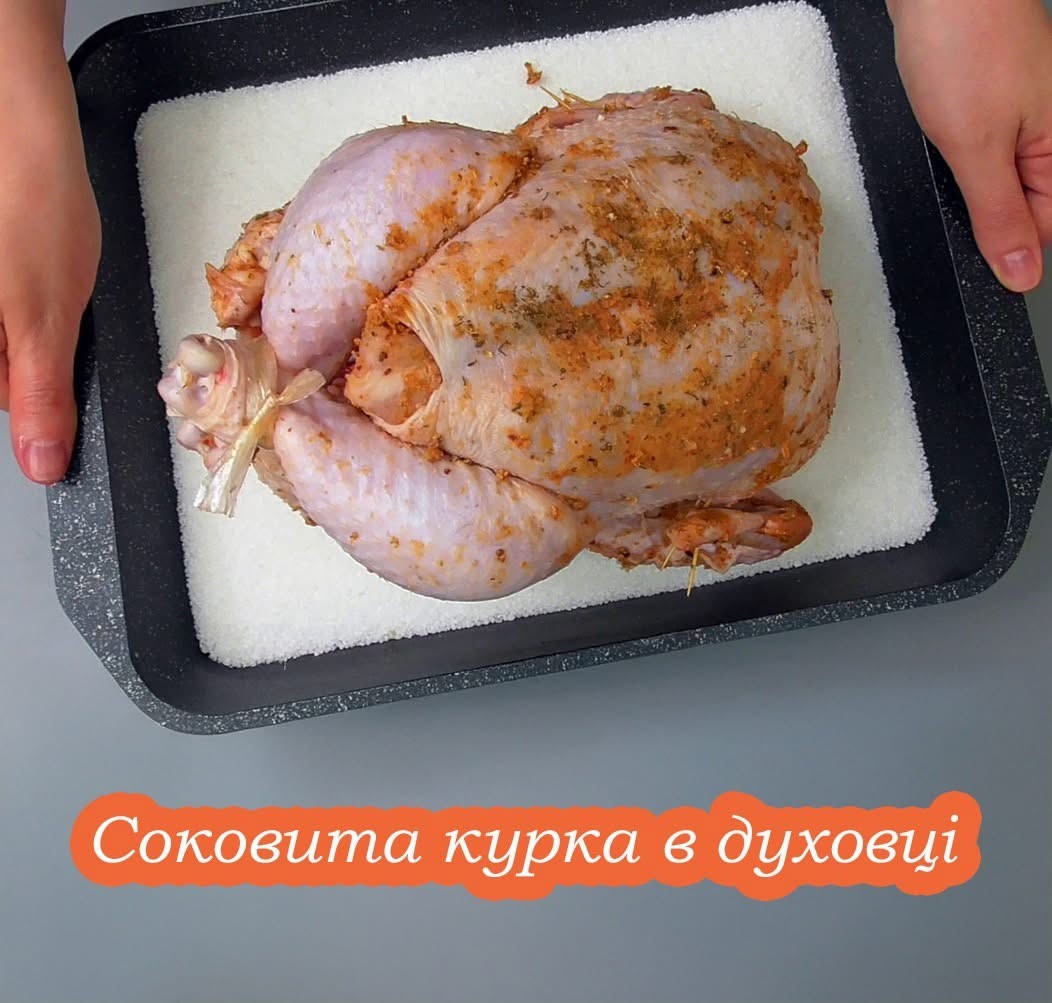 - Суміш солі та спецій: Натріть курку сумішшю солі, цукру та улюблених спецій. Сіль допоможе уповільнити випаровування вологи, а цукор надасть скоринці золотистого відтінку.