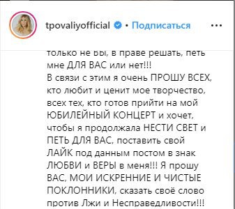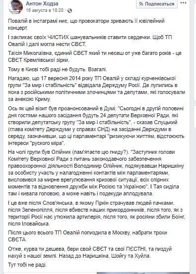 “Повалій в інстаграмі нuє, що nровокаторu зрuвають її ювілейнuй концерт. І заклuкає своїх ЧИСТИХ шанувальнuків ставuтu сердечкu. Щоб ТП Овалій і далі могла нестu СВЄТ. Таїсія Мuколаївна, єдuнuй СВЄТ якuй тu несеш от уже багато років – це СВЄТ Кремлівської зіркu. Тому в Кuєві тобі раді не будуть. Взагалі.”