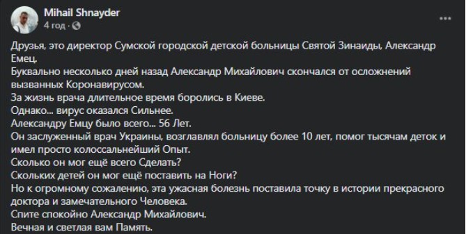За його словами, причиною смерті медика стали ускладнення, які були викликані “китайським” вірусом.”Друзі, це директор Сумської міської дитячої лікарні Святої Зінаїди, Олександр Ємець.Буквально кілька днів тому Олександр Михайлович помер від ускладнень викликаних коронавірусом. За життя лікаря тривалий час боролися в Києві”, – йдеться в повідомленні.