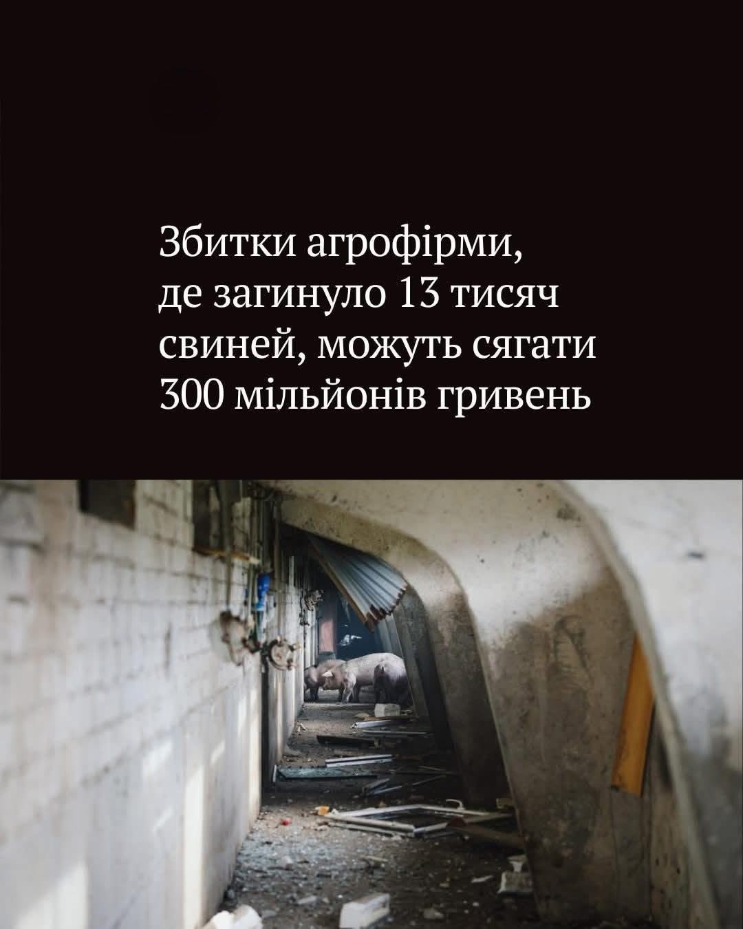 Сума збитків агрофірми на Харківщині, де росіяни знищили близько 13 тисяч свиней — може сягати 300 мільйонів гривень.