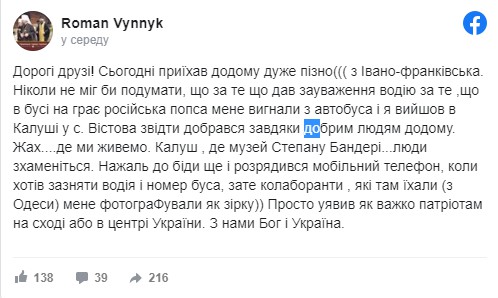 “Сьогодні приїхав додому дуже пізно, з Івано-Франківська. Ніколи не міг би подумати, що за те, що зробив зауваження водію, що в бусі награє російська попса, мене вигнали з автобуса і я вийшов в Калуші, у с. Вістова. Звідти добрався завдяки добрим людям додому. Жах… де ми живемо. Калуш, де музей Степану Бандері… люди, зхаменіться. На жаль, до біди ще і розрядився мобільний телефон, коли хотів зазняти водія і номер буса”, – написав священнослужитель.