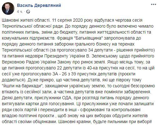 Фракція «Батьківщина» запропонувала до порядку денного питання заборони грального бізнесу на території Тернопільської області. «За» проголосували 34 депутати — рішення прийнято», — написав Деревляний.