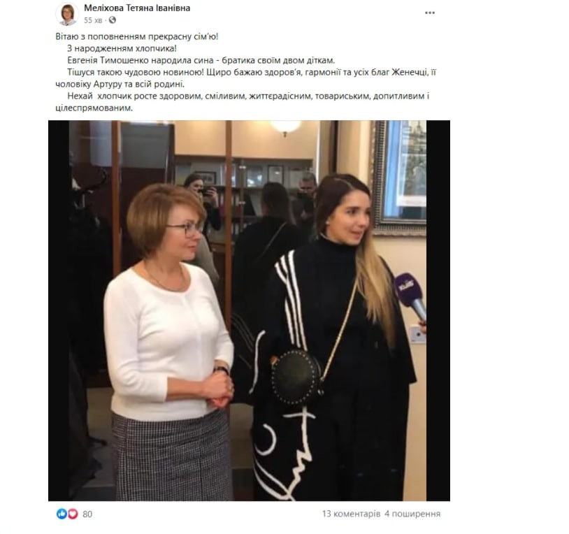 Як повідомила в Facebook секретар фракції "Батьківщина" в Київраді Тетяна Меліхова, у 40-річної Євгенії Тимошенко знову народився хлопчик.