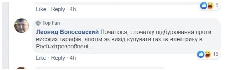 "Почалося, спочатку підбурювання проти високих тарифів, а потім, як вихід, купувати газ і електрику в Росії-хитрозроблені", – пише читач.