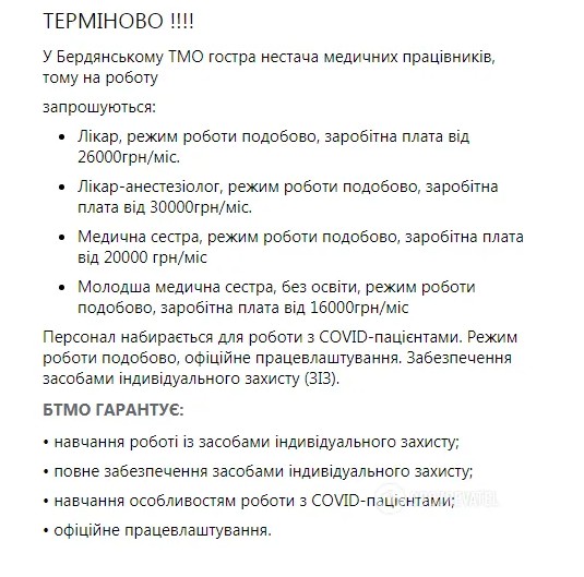 Тим часом на офіційній сторінці лікарні Бердянська з’явилося оголошення про набір медперсоналу для лікування пацієнтів із ковід.