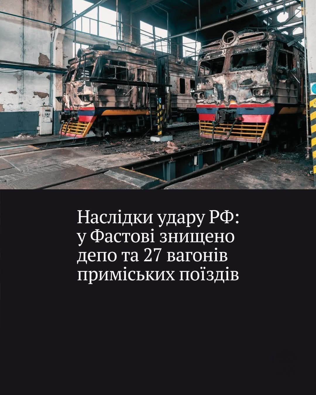 У Фастові на Київщині в результаті російського удару знищено депо приміських електропоїздів, а також 27 вагонів приміських поїздів.