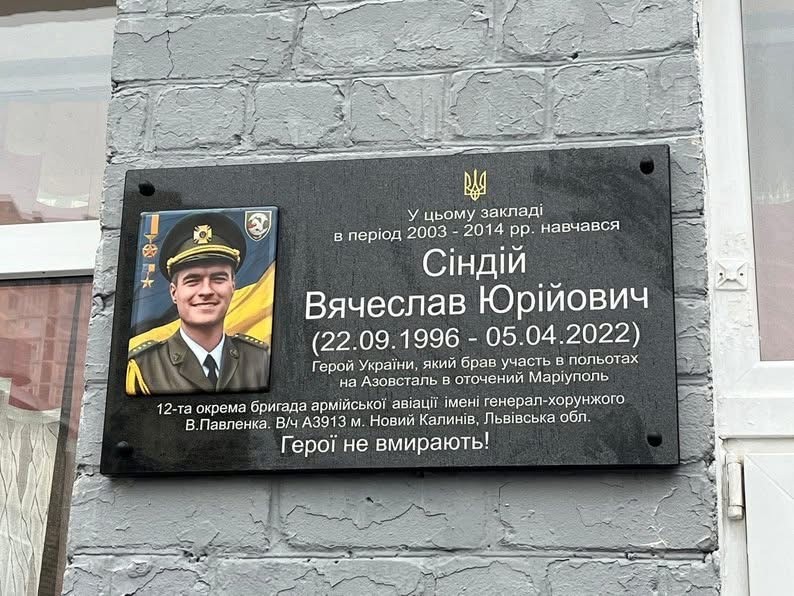 У Харкові відкрили меморіальну дошку Герою України В’ячеславу Сіндію — військовому льотчику, який загинув під час оборони Маріуполя. Меморіальну плиту встановили на фасаді ліцею №128, де він навчався.
