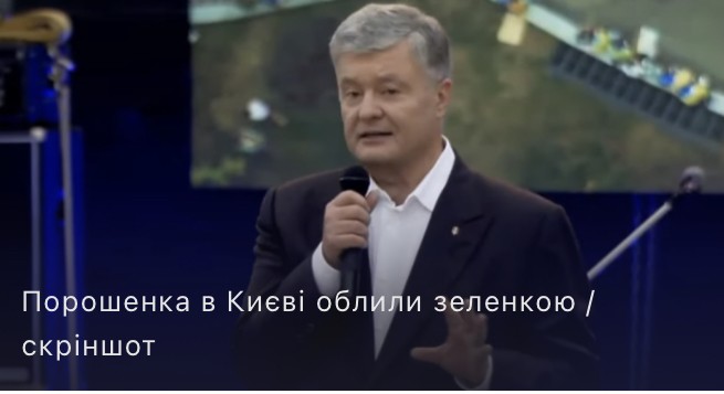 Як повідомляв УНІАН, у Києві облили зеленкою колишнього президента України Петра Порошенка. Це сталося на Хрещатику, після Маршу захисників, який пройшов у столиці. Інцидент трапився біля станції метро"Хрещатик". Невідомі облили Порошенка зеленкою, коли він після Маршу йшов до Кабміну. Політик звернувся за допомогою поліції і поїхав разом з правоохоронцями. Зеленка потрапила на обличчя і" залила " око Порошенка.