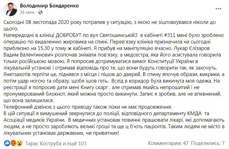 Екснардеп та ексголова столичної міської адміністрації Володимир Бондаренко звернувся до поліції після візиту до комерційної медичної клініки «Добробут». Причиною звернення стала поведінка працівників медустанови, які на вимогу Бондаренка говорити українською, вигнали його з кабінету, образили та застосували силу.