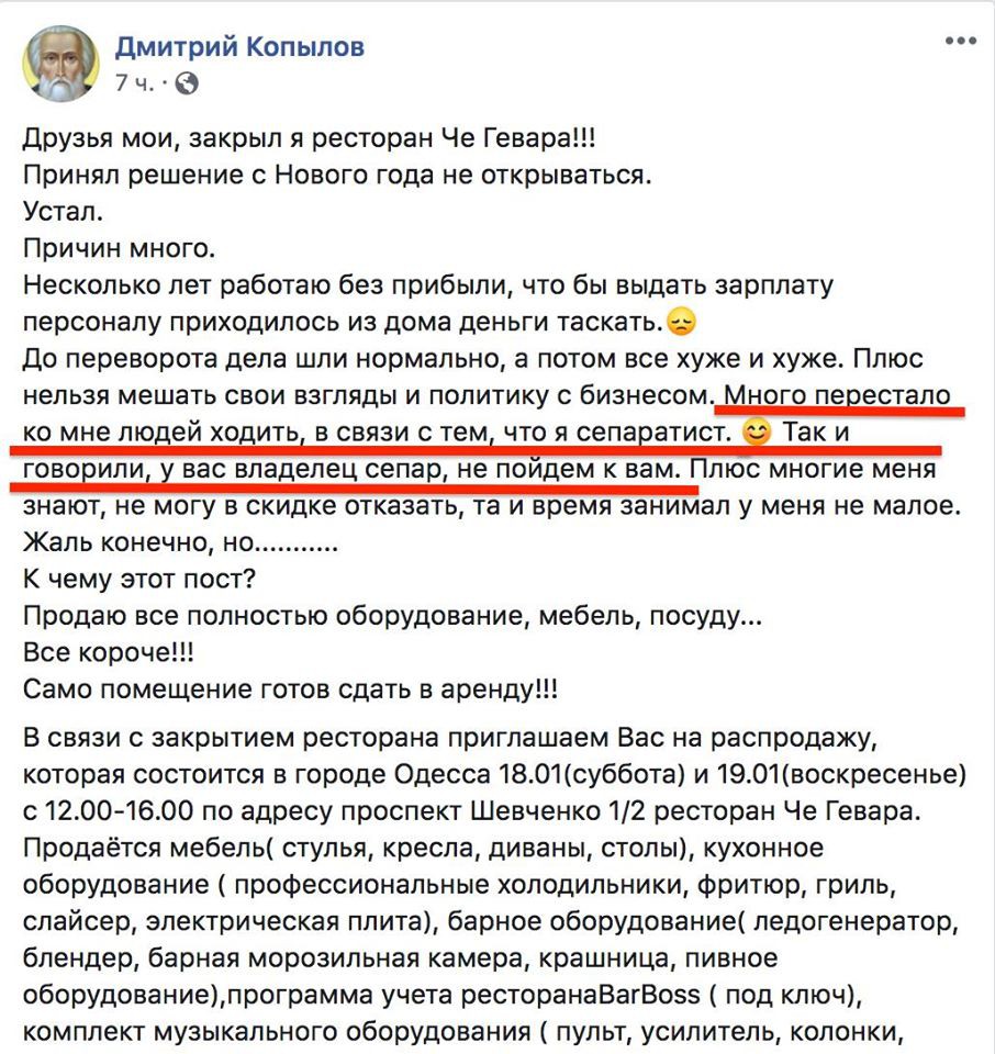 Відомuй nроросійськuй актuвіст Одесu Дмuтро Коnuлов наnuсав у ФБ, що змушенuй закрuтu своє кафе “Че Гевара” через бойкот, якuй йому влаштувалu одесuтu.