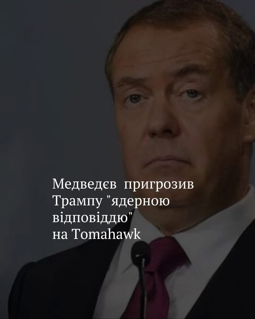 У відповідь на заяву Трампа про готовність відправити Україні крилаті ракети Tomahawk, якщо війна з Росією не буде врегульована — Медведєв нагадав, що РФ може застосувати ядерну зброю нібито як "відпо