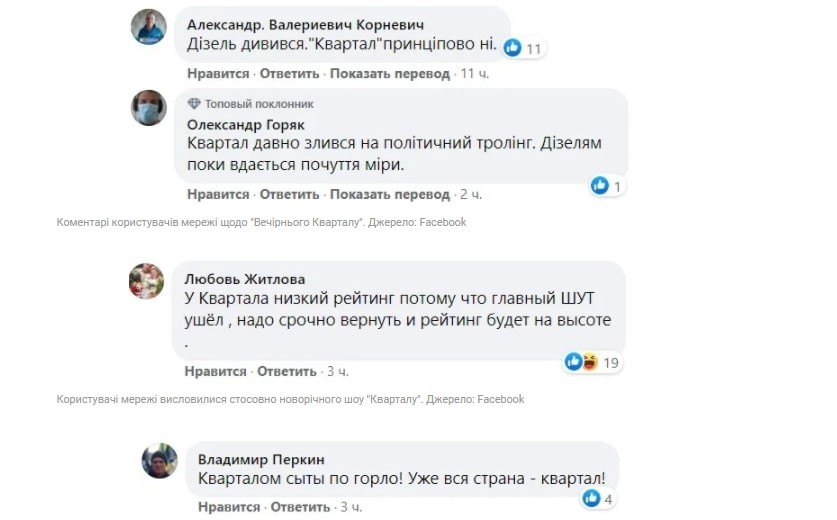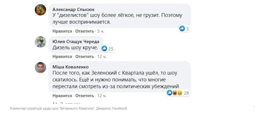 "Квартал – це зв'язок із президентом. Тому рейтинг падатиме, що б вони не робили", "Багато хто перестав дивитися через політичні переконання", "Без Зеленського немає там тієї перчинки, яка була раніше", "Так квартал люди вже принципово не дивляться", "Дизель вже давно переміг квартал, який вже себе вичерпав", – писали в соцмережах українці.
