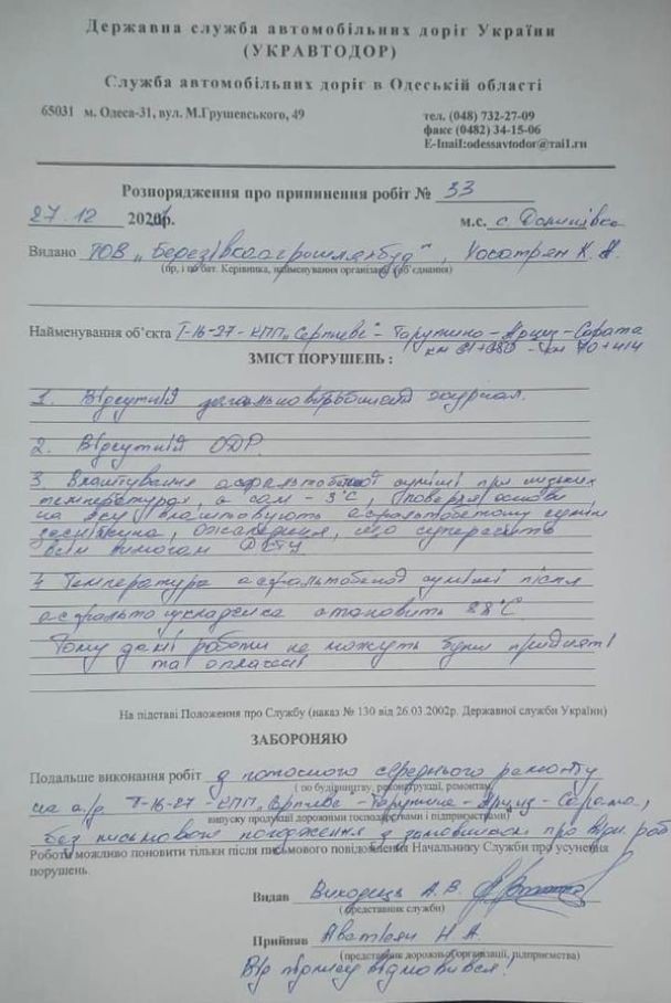 "Під час інспекції інженер Служби зафіксував, що при наявності опадів та мінусовій температурі повітря субпідрядна організація ТОВ СК "Автострой" проводить роботи з влаштування асфальтобетоного покриття на дорозі Т-16-27 КПП "Серпневе" – Тарутино – Арциз – Сарата, на ділянці км 61 – км 70", — зазначає "Укравтодор".