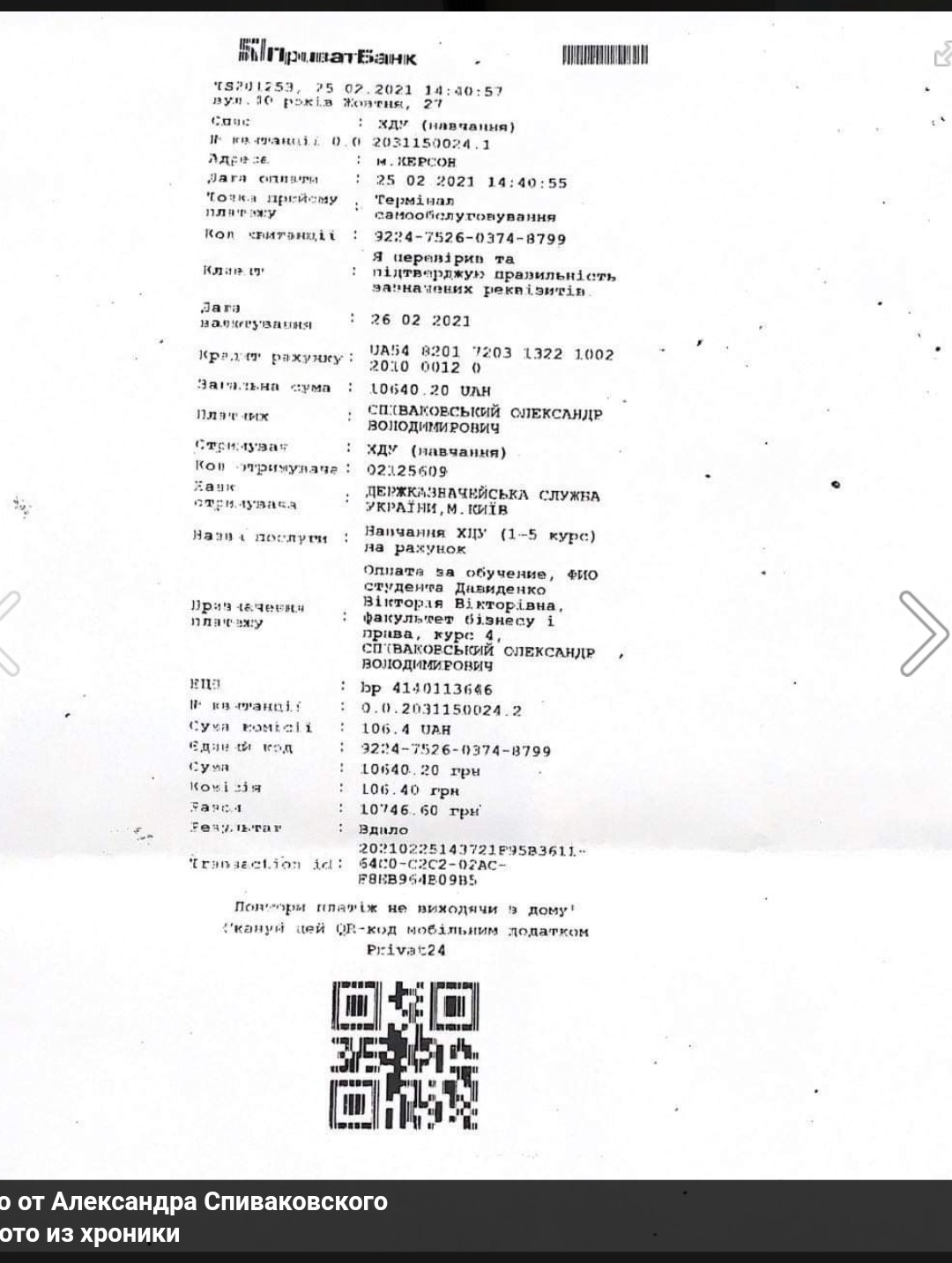 Ректор також показав чек на оплату навчання дівчини на суму понад 10 тисяч гривень.