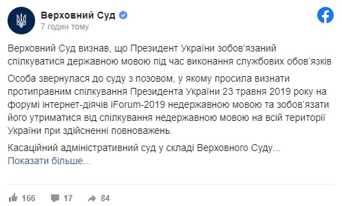 Велика Палата Верховного суду 7 жовтня визнала те, що під час виконання службових обов’язків президент України зобов’язаний спілкуватися державною мовою.