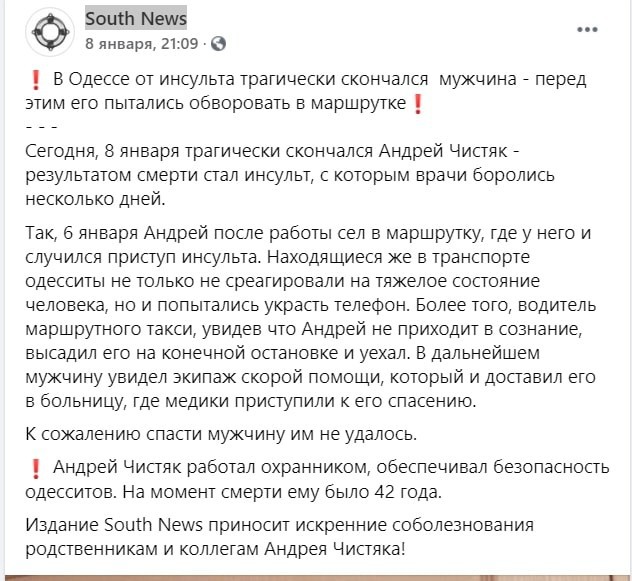 Таким чином, повідомляється, що іноді байдужість людей вражає, але ж іноді це може коштувати людині життя. Подібна історія трапилася і з 42-річним Андрієм Чистяком з Одеси.