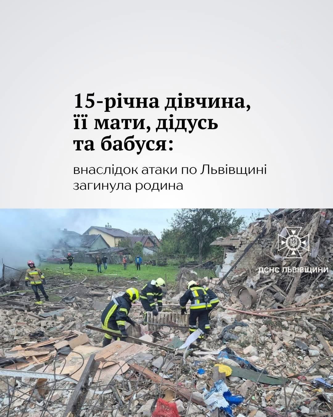 Вночі Росія завдала удару по Львівщині. Внаслідок атаки загинуло четверо людей в селі Лапаївка — усі вони були членами однієї родини. Найменшою загиблою стала 15-річна дівчина.