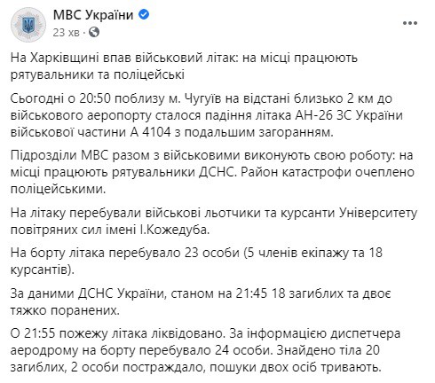 Підрозділи МВС разом з військовими виконують свою роботу: на місці працюють рятувальники ДСНС. Район катастрофи очеплено поліцейськими. На літаку перебували військові льотчики та курсанти Університету повітряних сил імені І.Кожедуба. На борту літака перебувало 23 особи (5 членів екіпажу та 18 курсантів).