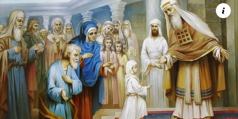 Дівчинка, якій за велінням янгола дали ім’я Марія, народилася в подружжя в похилому віці. Коли їй виповнилося три роки, батьки привели її до Єрусалимського храму. Згідно з переданням, Марія самостійно піднялася по сходах храму, не оглядаючись і не кличучи батьків. У храмі вона залишалася до часу заручин із Йосифом, присвячуючи своє життя молитвам і служінню Богу.