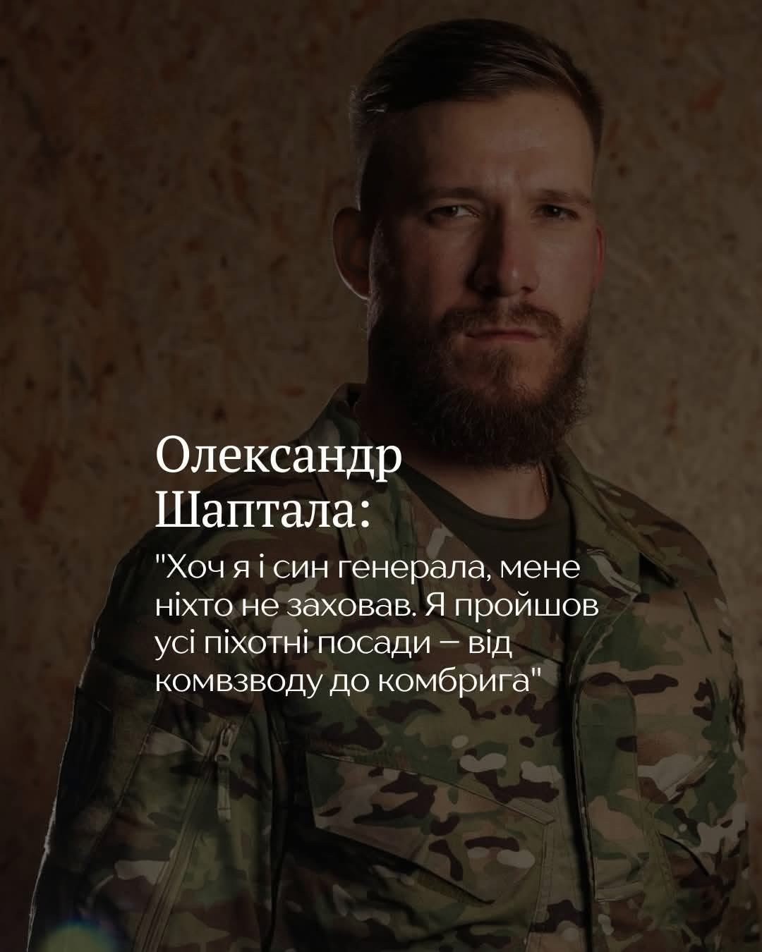 Однак про цей факт, як здалося УП з годинного інтерв'ю, Олександр Шаптала волів би не говорити. Щоб не присвоювати собі заслуг батька й будувати військову кар'єру, про яку він мріяв з дитинства, винятково на своїх рішеннях і вчинках.