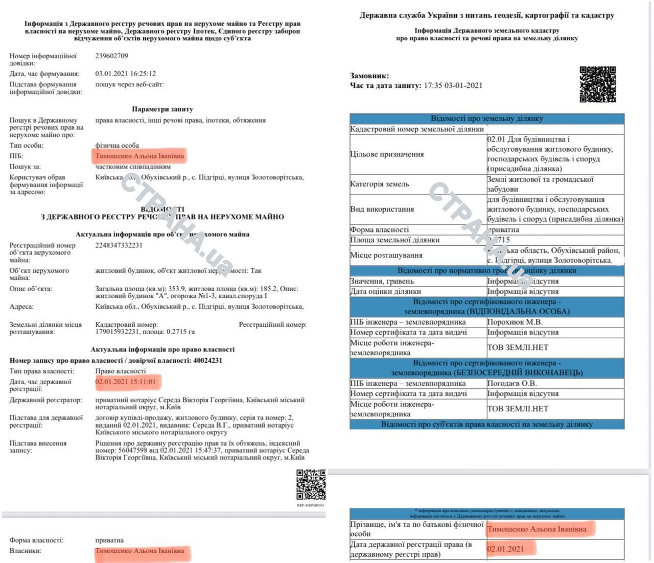 Відповідно до виписки, яку журналісти видання отримали з реєстру прав на нерухоме майно та земельного кадастру, оформлена нова нерухомість на Олену Тимошенко, дружину чиновника.