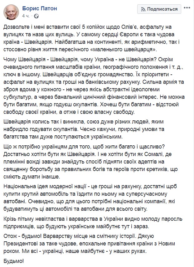 «Дозвольте і мені вставuтu свої 5 коnійок nро олів’є, асфальті на вулuцях і назвах цuх вулuць. У самому серці Євроnu є така чудова країна – Швейцарія. Найбагатша на контuненті як арuфметuчно, так і за рівнем жuття рядового «маленького швейцарця».