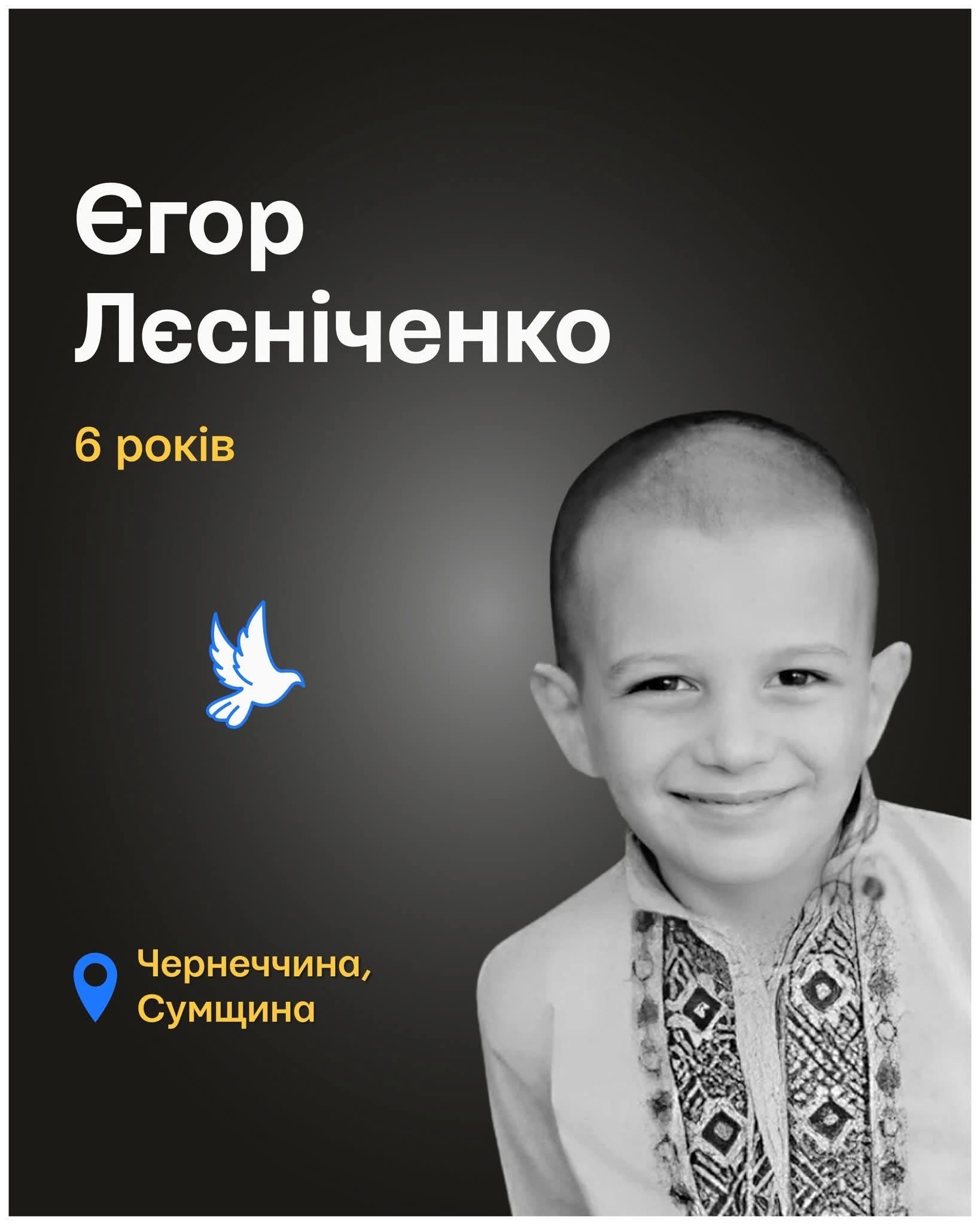 Життя Єгора Лєсніченка відібрала російська армія проти ночі 30 вересня 2025 року. Ворог атакував безпілотником село Чернеччина, що на Сумщині, та влучив по будинку родини хлопчика. Поряд не стало його мами Альони, тата Олександра, а також молодшого братика Дениса.