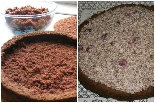 Крок 3. Борошно перемішати з какао. Додати до основної маси та усе перемішати. Змастити форму та вилити рідину. Випікати до готовності. Після вистигання, розрізати корж навпіл. Середину коржа вибрати. М’якоть подрібнити на шматочки.